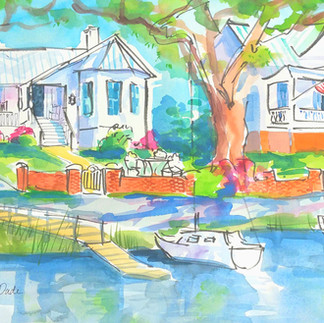 "Waterfront Christmas" - 22" x 24", watercolor/pen, $595